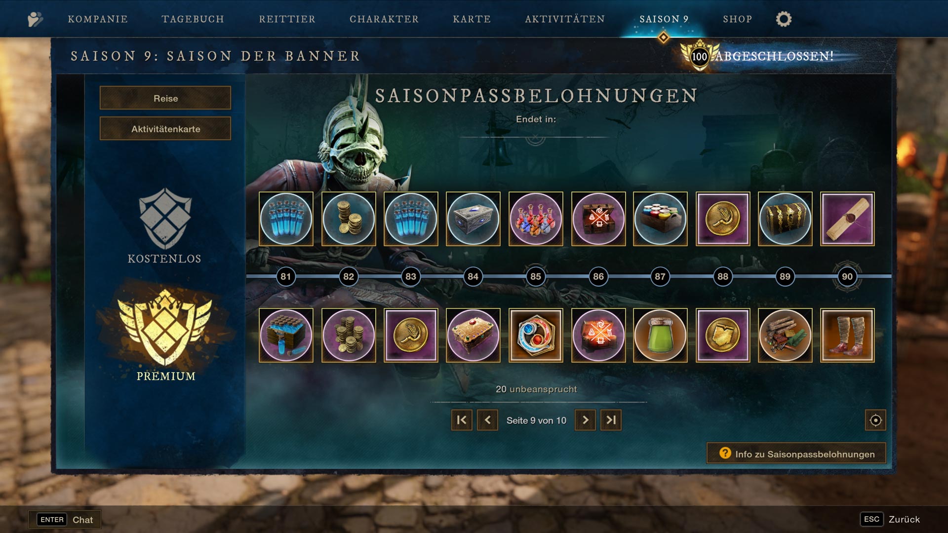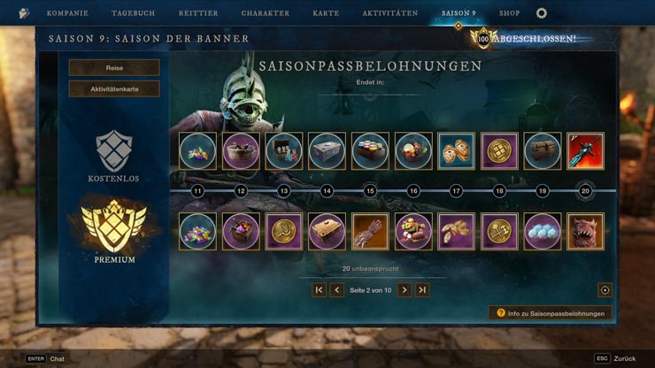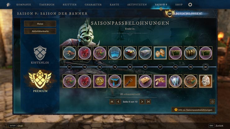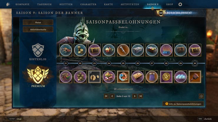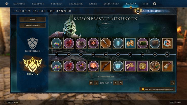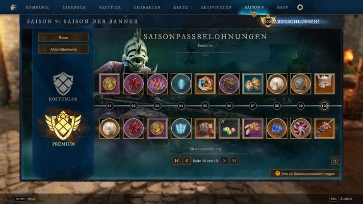 Saison 9 führt eine 100-stufige Belohnungsserie voller Premium-Kosmetik, mächtigen Verbrauchsgegenständen, Herstellungsmaterialien, Transmog-Marken, Emotes und vielem mehr ein. Spieler sammeln Saison-EP, indem sie Reiseziele abschließen, Matches im Fahnenraub absolvieren, Aktivitätenkarten-Aufgaben vollenden und Bonusmissionen angehen. Diese EP-Meilensteine schalten auf jeder Stufe neue Belohnungen frei.