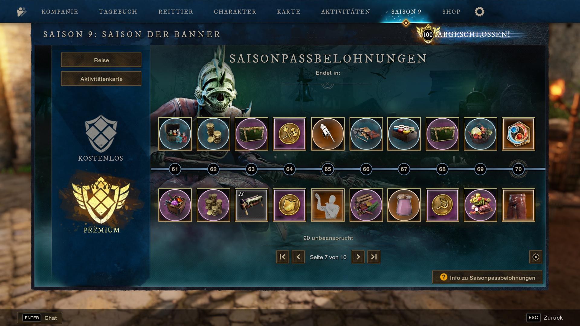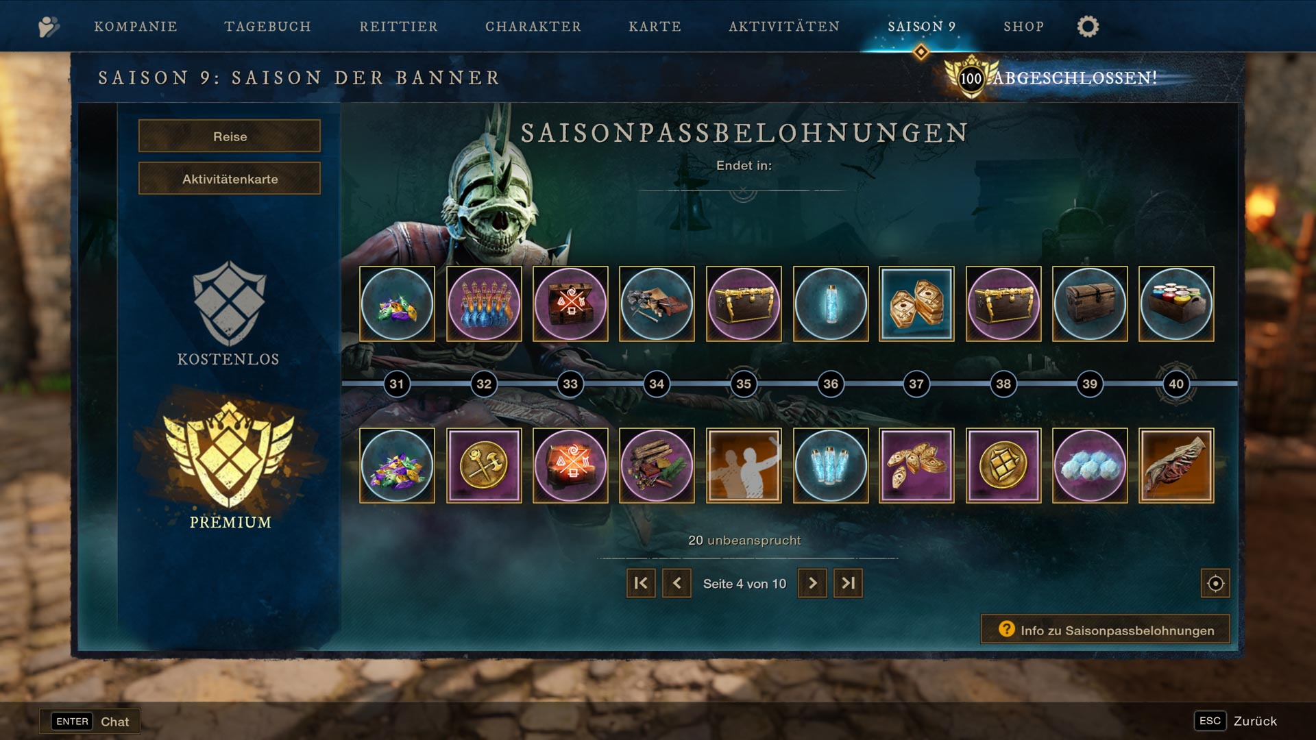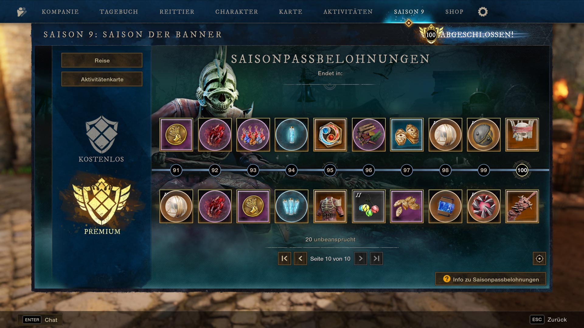Saison 9 führt eine 100-stufige Belohnungsserie voller Premium-Kosmetik, mächtigen Verbrauchsgegenständen, Herstellungsmaterialien, Transmog-Marken, Emotes und vielem mehr ein. Spieler sammeln Saison-EP, indem sie Reiseziele abschließen, Matches im Fahnenraub absolvieren, Aktivitätenkarten-Aufgaben vollenden und Bonusmissionen angehen. Diese EP-Meilensteine schalten auf jeder Stufe neue Belohnungen frei.
