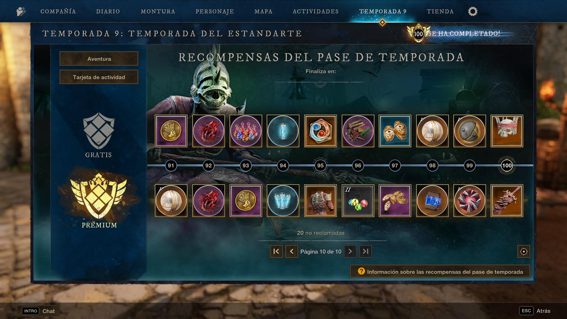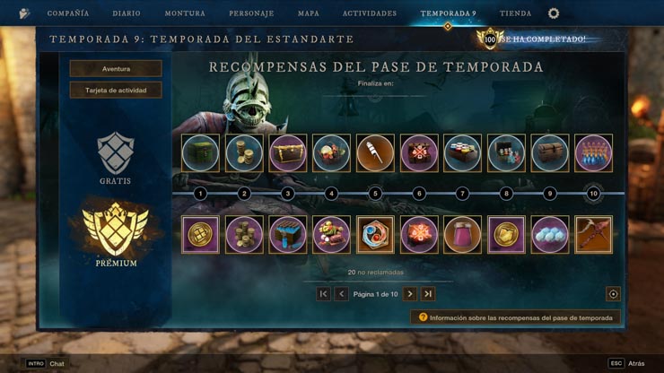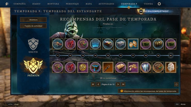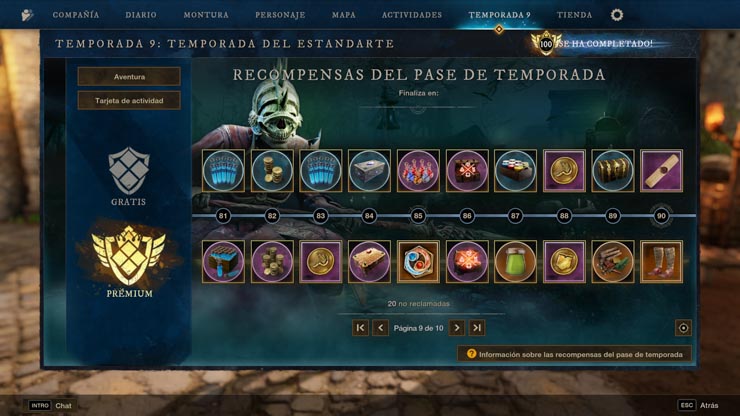 La temporada 9 llega con un seguimiento de recompensas de 100 niveles repleto de artículos cosméticos prémium, consumibles poderosos, materiales de artesanía, blasones de transformación, gestos y mucho más. Ganaréis EXP de temporada completando objetivos de la aventura, partidas de Captura la bandera, tareas de la tarjeta de actividad y misiones de bonificación. Estos hitos de EXP desbloquearán nuevas recompensas tras cada nivel.