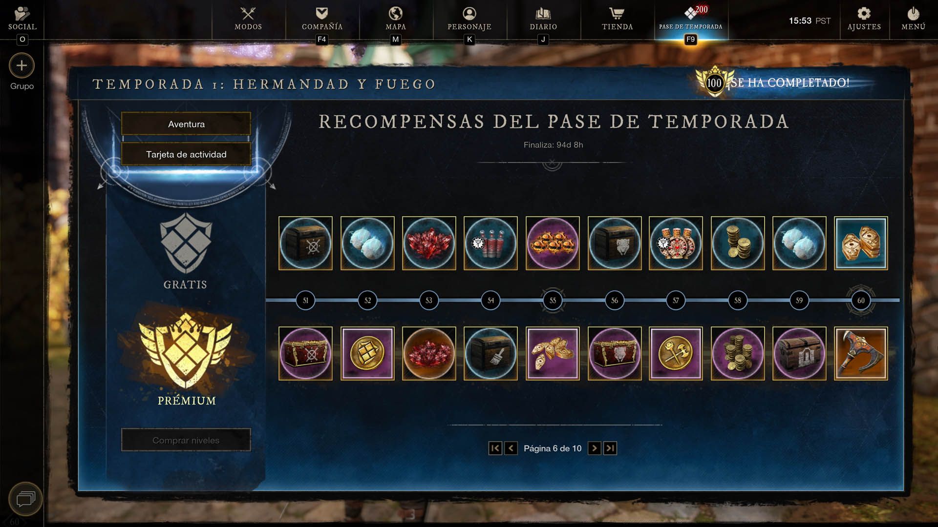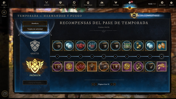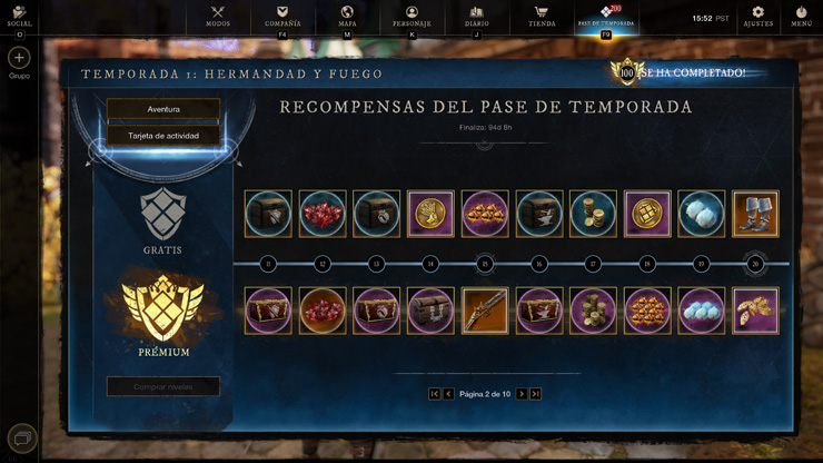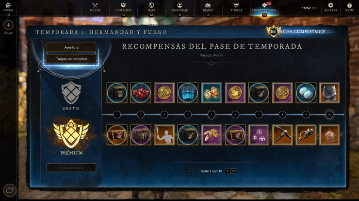 El seguimiento prémium solo se puede adquirir a cambio de marcas de fortuna en la pantalla del pase de temporada. Abrid New World: Aeternum», y una vez dentro, id a la pestaña Temporadas del menú o pulsad la tecla F9 para comprar el pase desde ahí. Si necesitáis marcas de fortuna, están disponibles en la tienda del juego.