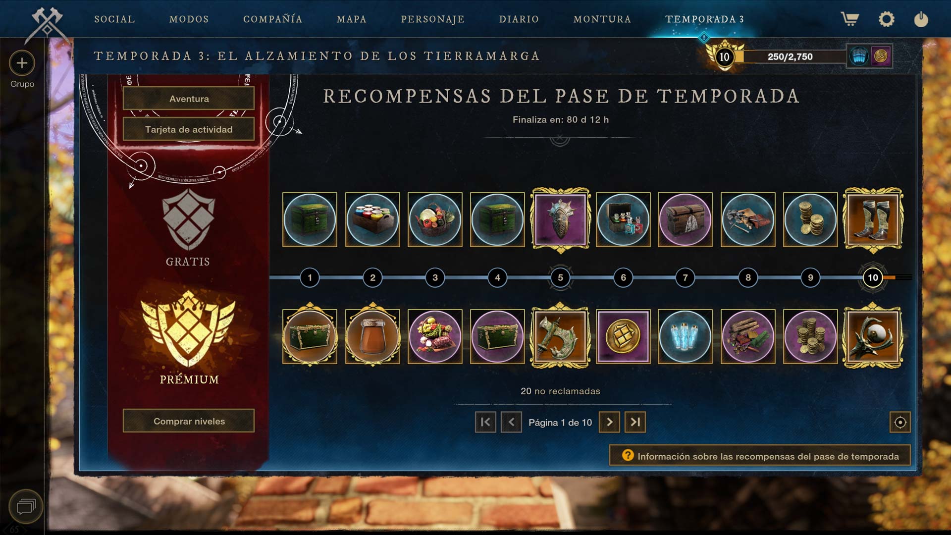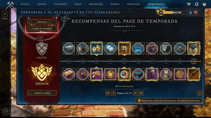 El seguimiento prémium solo se puede adquirir a cambio de marcas de fortuna en la pantalla del pase de temporada. Abrid New World: Aeternum», y una vez dentro, id a la pestaña Temporadas del menú o pulsad la tecla F9 para comprar el pase desde ahí. Si necesitáis marcas de fortuna, están disponibles en la tienda del juego.