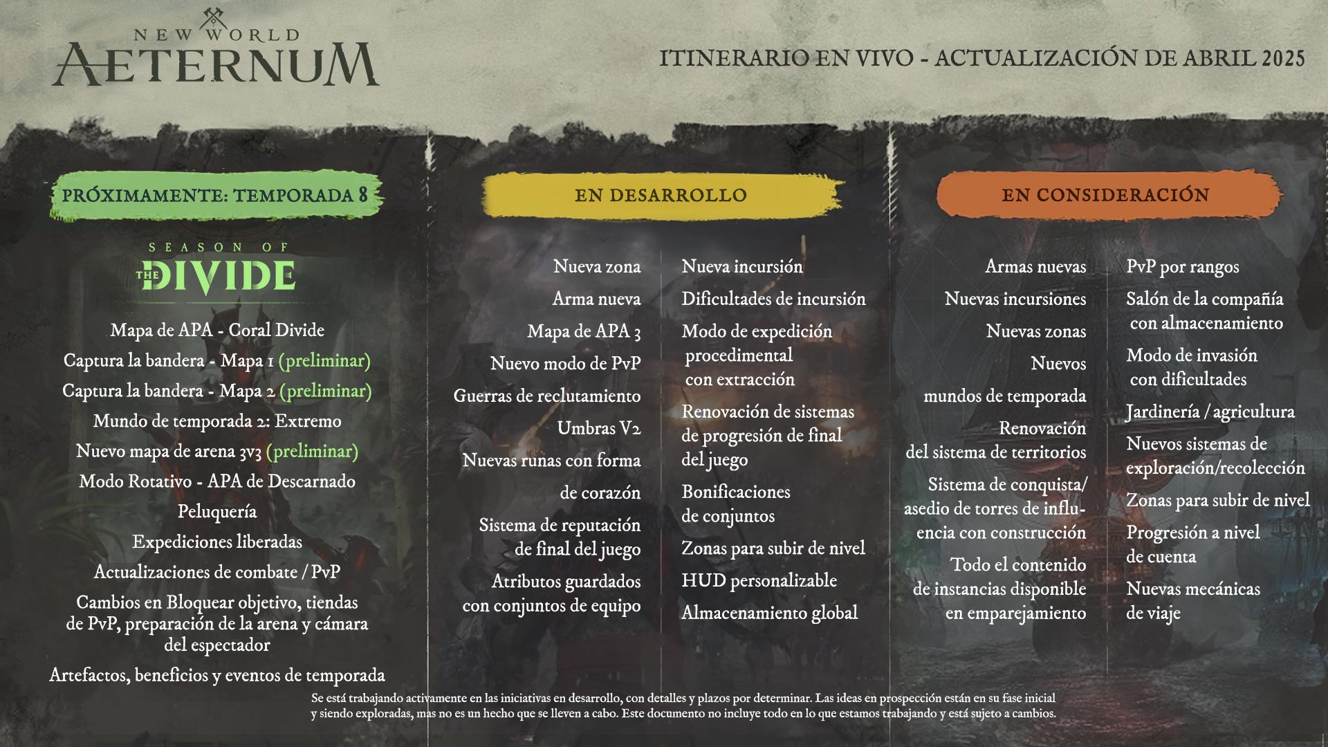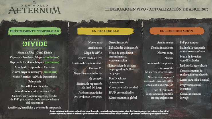 La Temporada 8: La Temporada de la División está por venir y con ella trae una ola de nuevo contenido, funciones y actualizaciones para New World: Aeternum/ Para ayudar a los jugadores a mejor seguir lo que va a llegar para la Temporada 8 y más allá, vamos a conitnuar con nuestro formato de Hoja de ruta actual. Nuestro objetivo es mantenerlos informados en lo que progresa el desarrollo a través de 3 etapas.