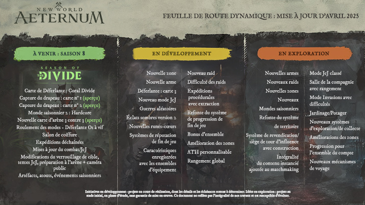 La saison 8 : Saison du fossé arrive bientôt, avec du nouveau contenu, des fonctionnalités et des mises à jour pour New World: Aeternum. Afin d’aider les joueurs à mieux suivre ce qui va arriver pour la saison 8 et au-delà, nous continuons avec notre format de feuille de route vivante. Notre objectif est de vous tenir au courant des progrès du développement en trois étapes :